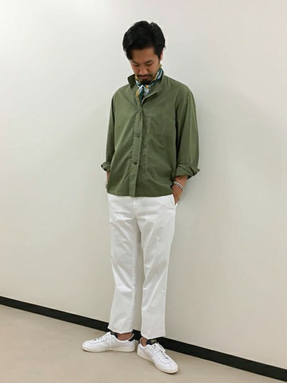 キレイ目なミリタリージャケットとホワイトのパンツで、色数を抑えてシンプルにコーディネートしました。首元に多色使いのスカーフを巻いて少しだけ色を加えています。ジャケットとはいえポプリンの素材でとても軽く、シャツ感覚で着られるので、軽快なミリタリースタイルが楽しめます。