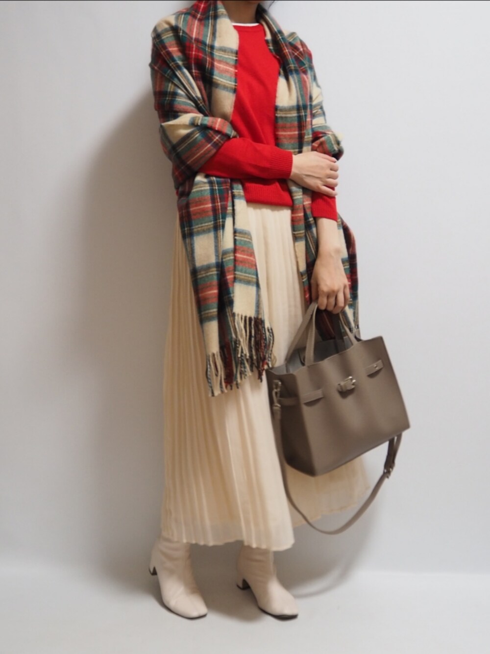 ストール 神戸レタス 赤ニット イーザッカマニア スカート ニッセン ショートブーツ グレイル