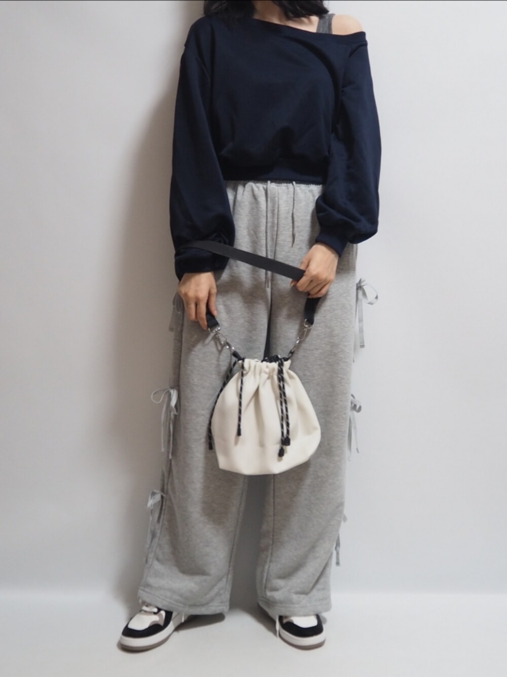 ネイビーのオフショルダー スウェット グレーのタンクトップ グレーのリボン付きワイドパンツ スウェット ホワイトのバイカラースニーカー ホワイトの巾着バッグ