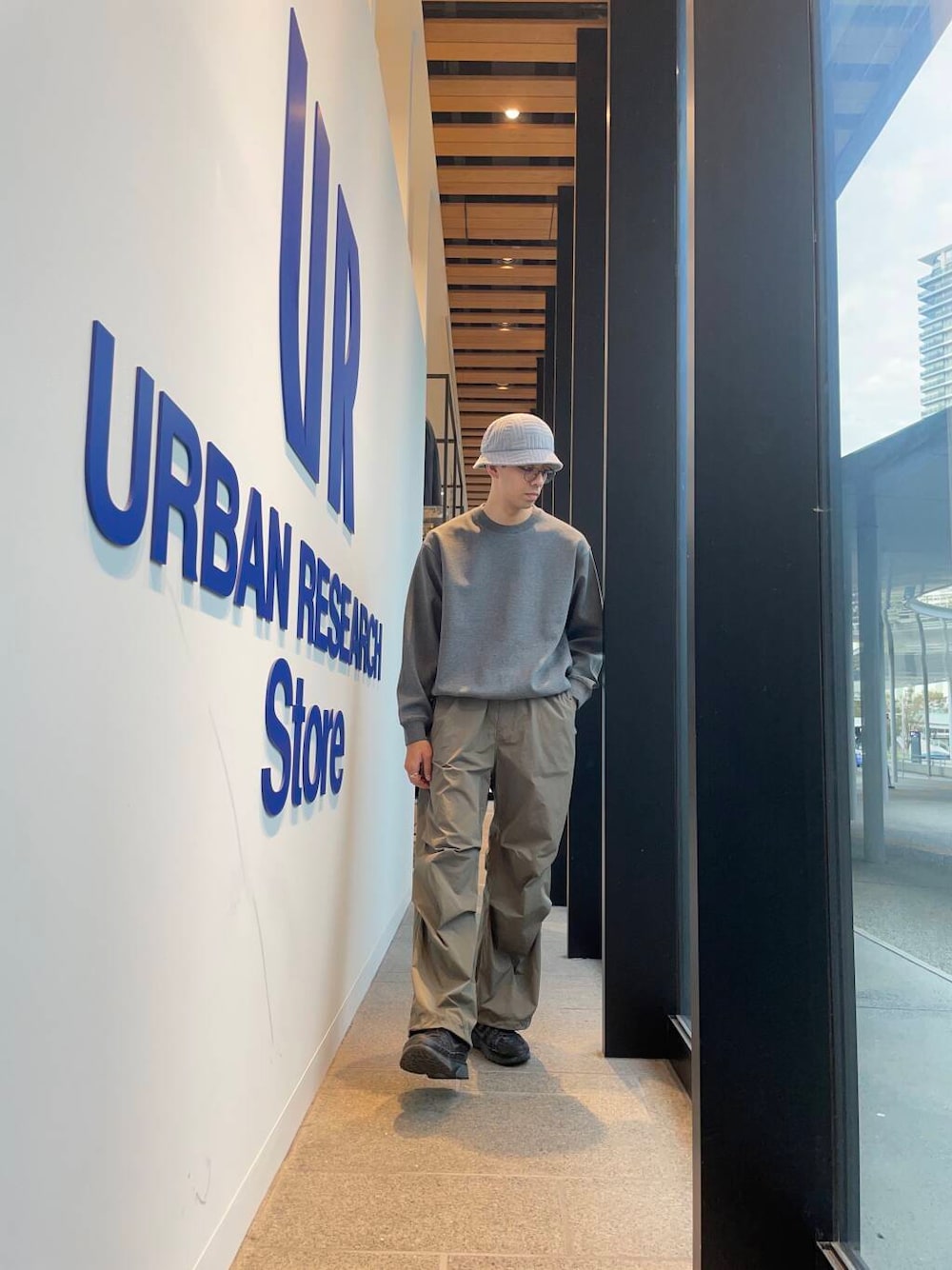 グレーなスタイリング リブが強めでスタイルアップしやすいダンボールスウェットと股下長めなナイロンパンツでアクティブ脚長おじさん 出勤スタイルです🫥