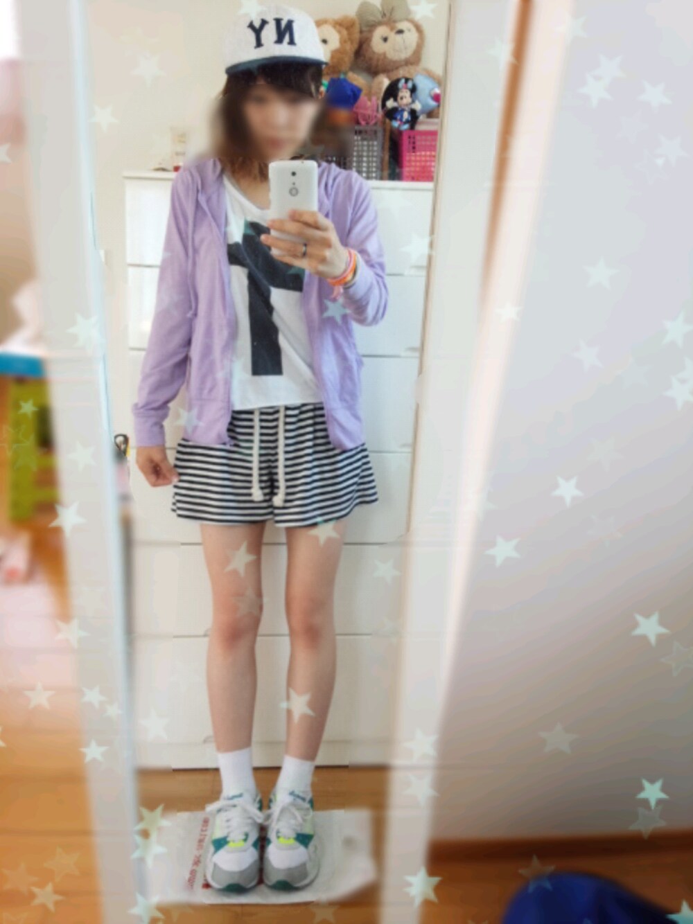 娘とお散歩* 買ったばかりのNYキャップは レース地でかわいいのです ^o^ NYキャップ ネットで購入 パーカー ? Tシャツ GRL インナー イーハイフン ボーダーのボトムス WEGO くつした H&M スニーカー リーボック