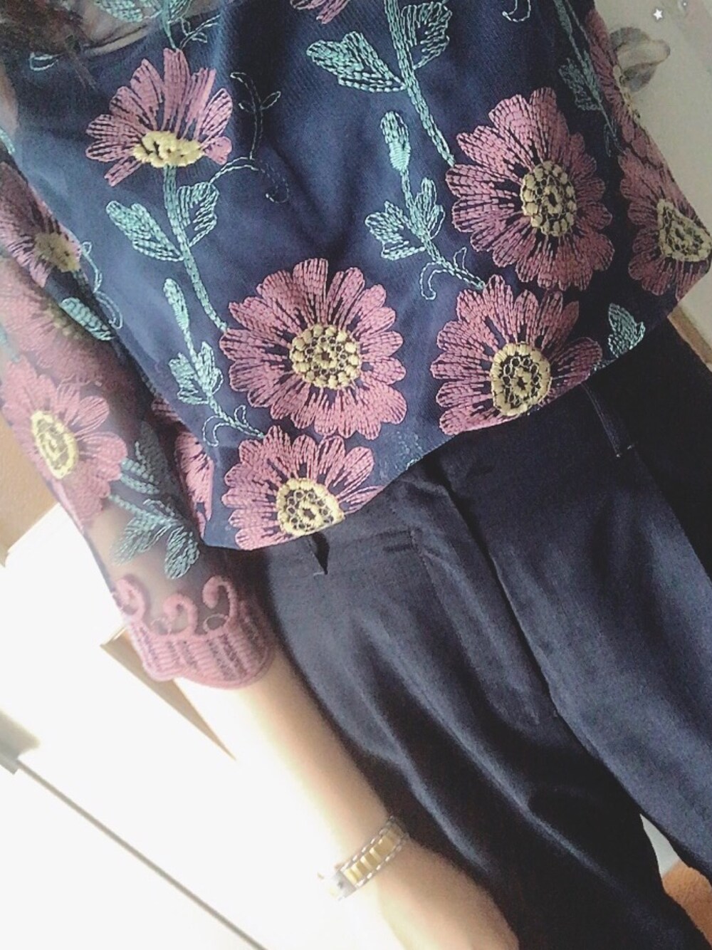 まるがおのシャツ/ブラウス「刺繍入りチュールレースプルオーバー」を使ったコーディネート