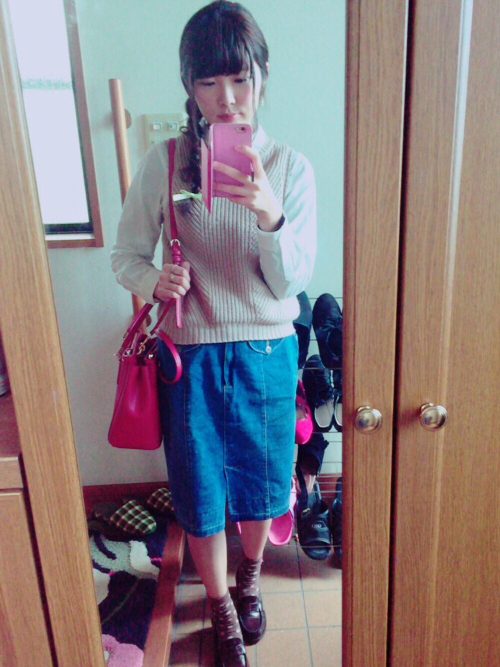 GreenParksのトップスはニットベストとシャツのセット(*^o^*) 別々に使えて着回しききます。 coachの赤いバッグは最近買ってアクセントにもなるからお気に入りです(^O^)/ 片方でみつあみをしてリボンをつけてみました★