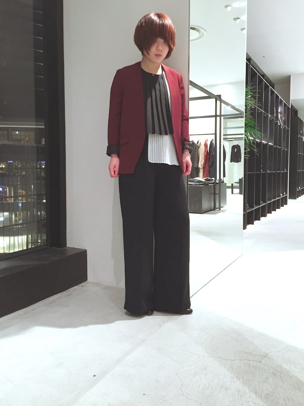 プリーツのトップスをパンツにタックインしてジャケットと。 トップスは3色展開の中、マルチをチョイスすることでデザインを分かりやすく。