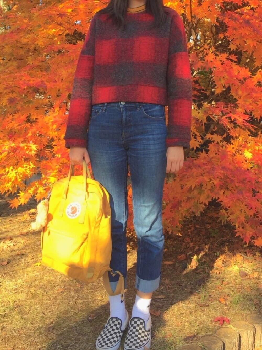 . 紅葉狩りコーデ🍂 紅葉を意識しすぎた感😂 そしてやっと紅葉の良さに気づいた18歳。 ハイウエストのジーンズと丈の短いセーターを合わせたら足長に見える。気がする☺️