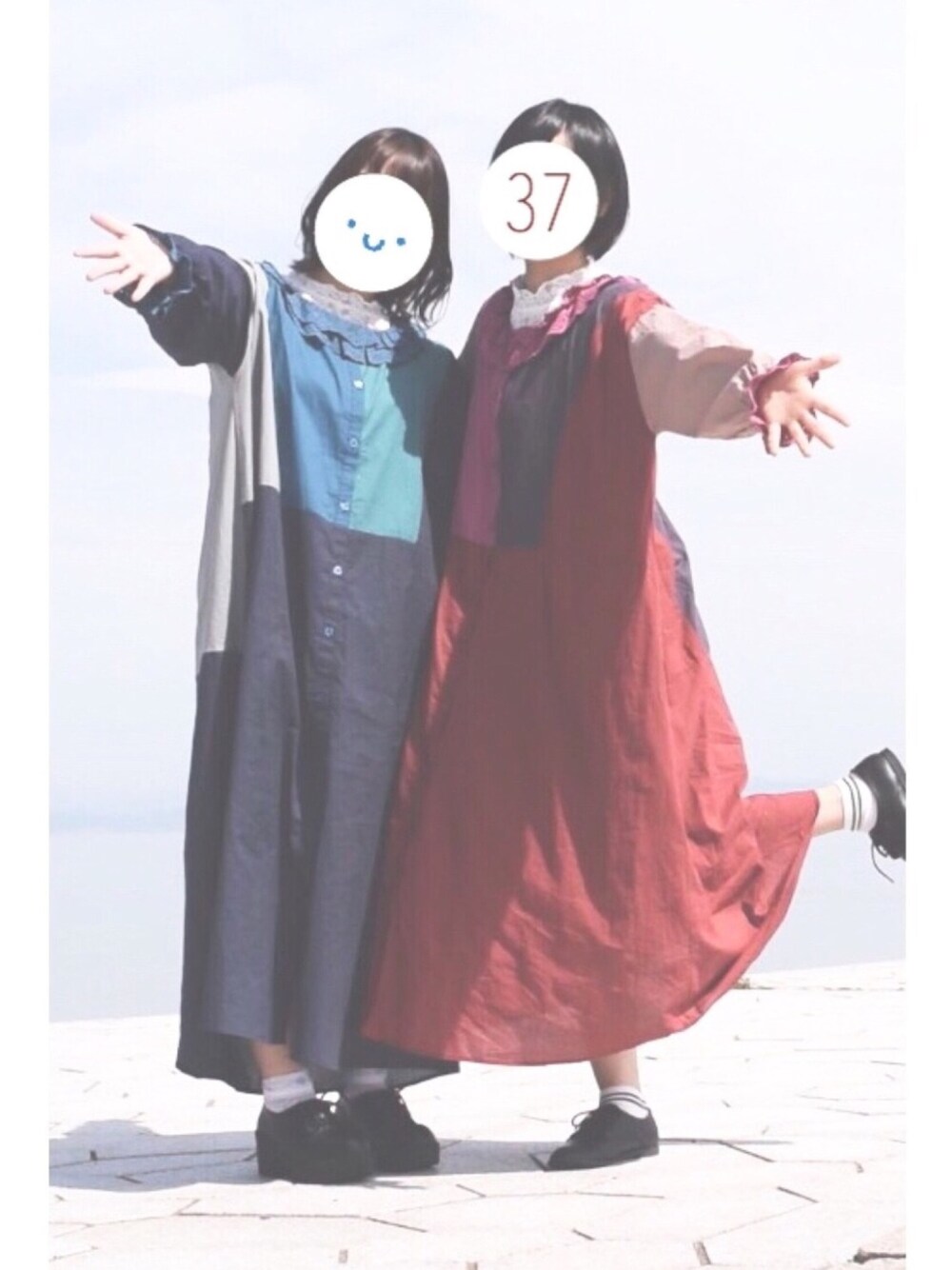 一目惚れで相方分も購入したワンピース。 寒色と暖色のパッチワーク。並ぶと可愛さ倍増ですね♡ ✎ . 37