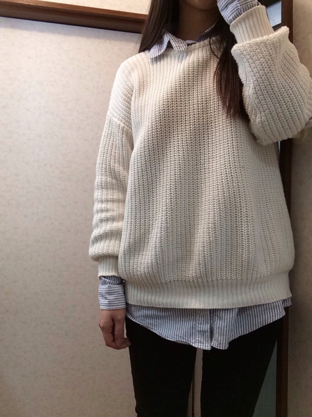 ニットの中に長めのシャツを着る。 ってのいいんじゃないのー? と思ってしてみたけど。 ニットが長いから? あんまわかんない感じに。。 でも爽やか風だしね。 良しとする!