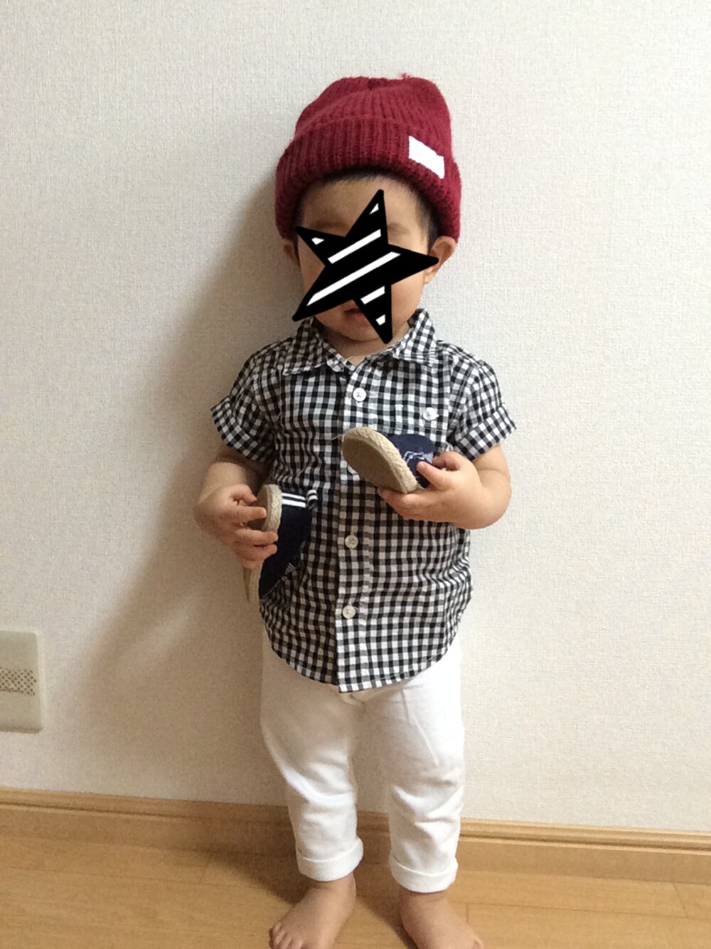 まだまだ半袖コーデ。...蒸し暑い。 春頃履く予定で買ったHAKKAのエスパドリーユ。 歩き始めたのは7月末(笑) サイズがピッタリになった今、甲高の息子の足に入らない...(T_T)