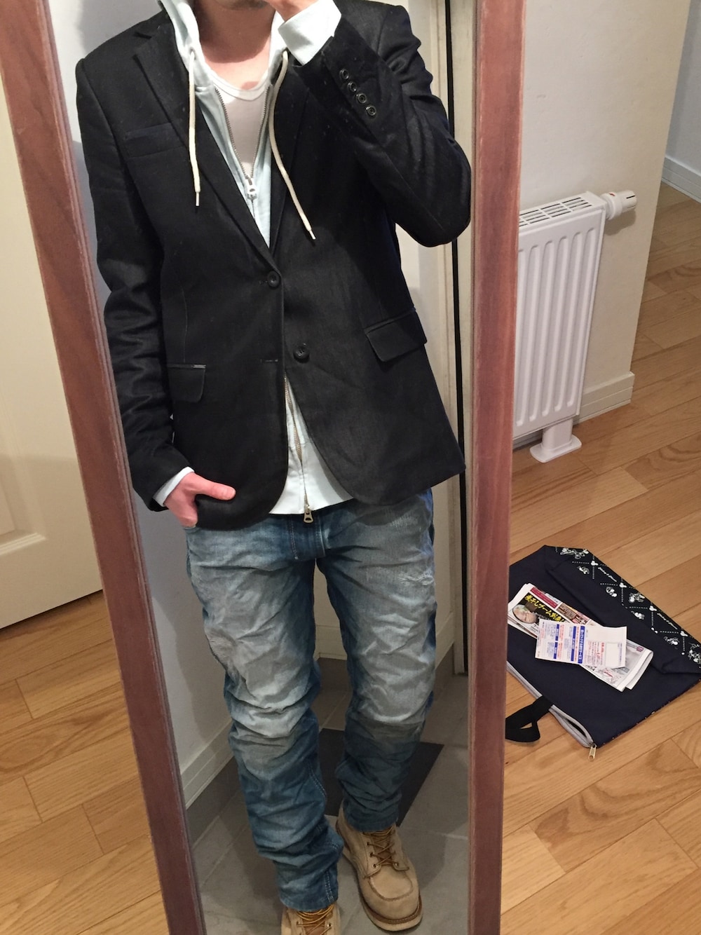 アウターはDIESELのテーラード。けっこうカッチリしてます。黒色。Lサイズ。インナーのchampionのパーカーとなかなかの相性。パーカーの色微妙かなと思いましたけど、けっこう使えます笑 デニムはDIESELのKRAYVER840V。クラッシュ&リペアかなり気合い入ってます。さすがブルーアイコン。w.30ですが、少し大きいです´д` ;