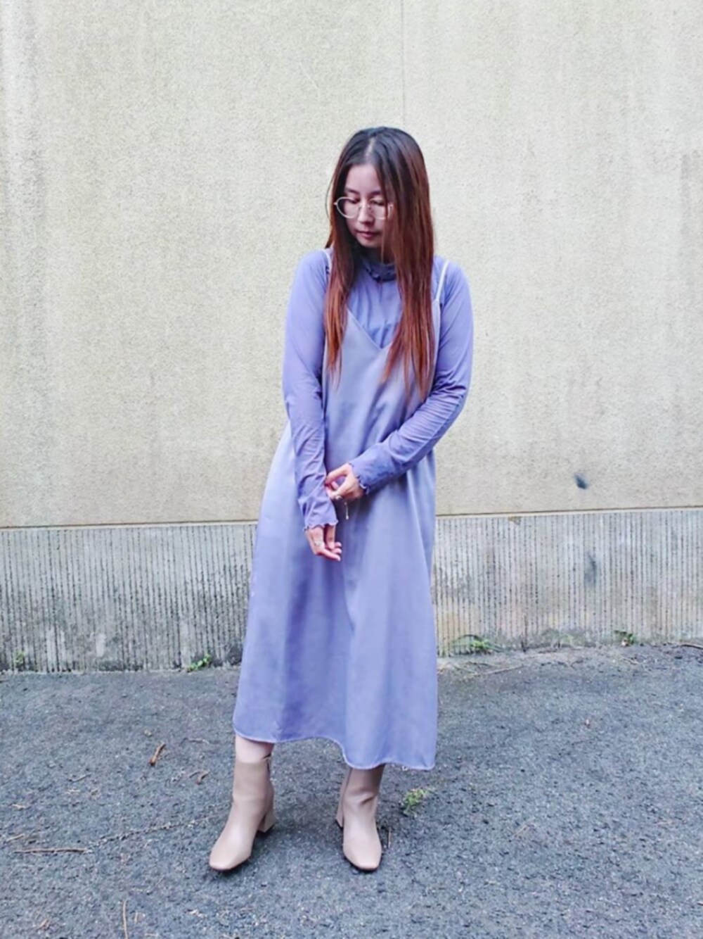 . . こないだのかっこ。 . パープルコーデ~💜 . シアーメローロングTに サテンバックリボンワンピで ワントーンに♡︎ . サテンワンピは 動く度にサテンの光沢が揺れるの 大好き♥︎ . あと、バックリボン可愛いのに 気付かずに ほどけかけてるし😂 . . そして… ブーツはじめました~👢✨ . ベージュのブーツは ヒールの形がチャンキーヒールみたいに 太いところが好き♪ . これ形が本当に綺麗で ヒール苦手な私でも 足が痛くならなくて楽だったから ブラックも購入予定🤭🖤 . . . . . . . . . . . 𖧷tops… gu_for_all_ gu_global 𖧷onepiece…GU 𖧷boots…GU 𖧷ring… unitedarrows_official nikoand_official agreablmant_womens soierie_official _trifles 𖧷glasses… jins_japan jins_snap