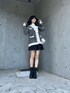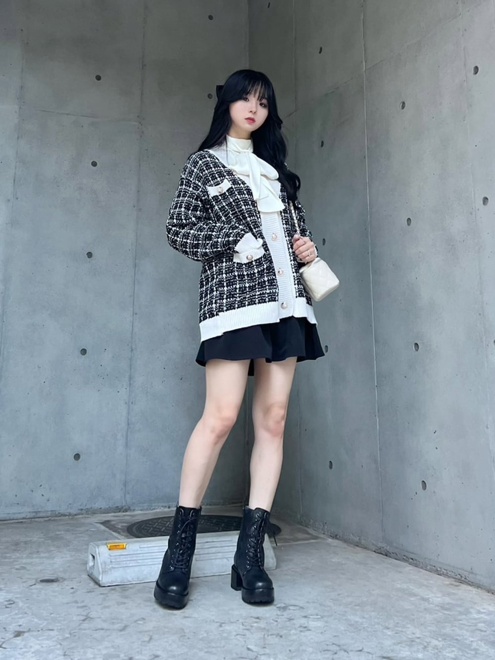 poyoのカーディガン/ボレロ「【ファッションインフルエンサーPOYO×titty&Co.PETIT 】ツイードチェックゆるカーディガン」を使ったコーディネート