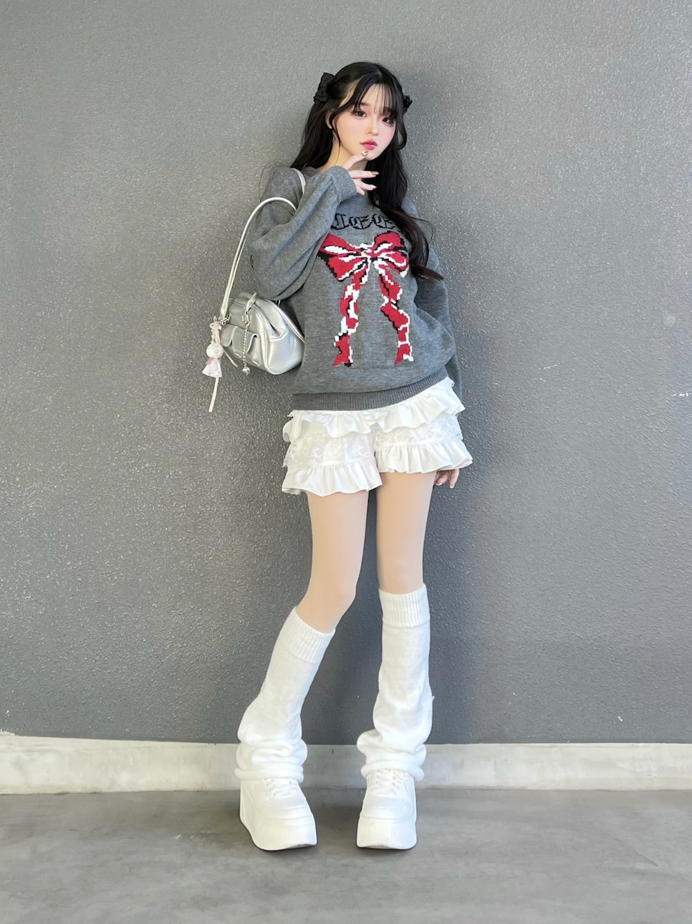 poyoのニット/セーター「リボンジャガードルーズニット/赤ニット」を使ったコーディネート