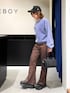コージーフレアパンツを使った春コーデ💙 【ボトムス】 サラッとした生地感でストレスフリーで履いていただけるフレアパンツです!中央にラインが入っているので足が長く細くスタイルよく見えるようになっています✨ S,M,Lの3サイズ展開なのでそれぞれの身長に合わせてサイズを探していただけるのも有り難い!!🥹 156cmの私がSサイズに約8cmの厚底シューズを履いてこれくらいの丈感になります!