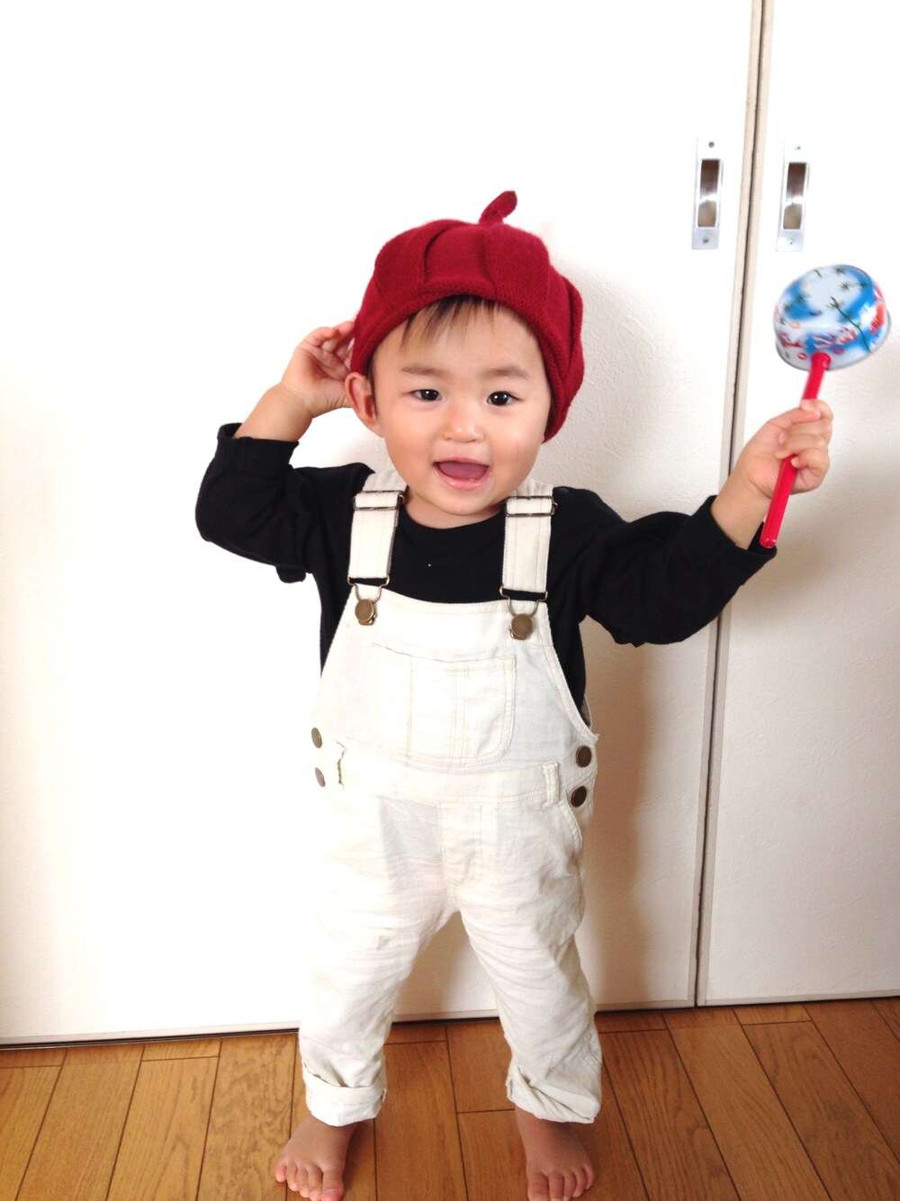 とんがり帽子かぶるのイヤイヤ〜😂😂 くつ下イヤイヤ〜のmiaさんです💦 マーキーズのフリルロンT可愛い💕 オーバーオールはおばあちゃんからの誕生日プレゼント🎁ありがとう😊