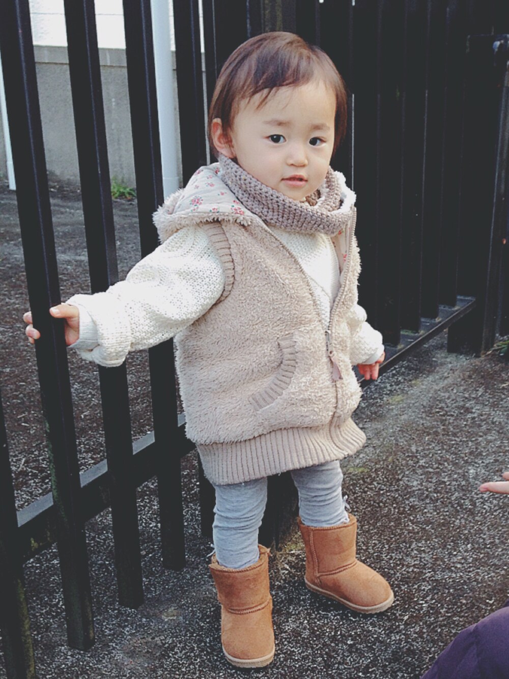 モコモコホワイトコーデ❣️ 白とかベージュがしっくりくるタイプ🤔 今日もあったかいので、ベストで十分😄 7歳上のお姉ちゃんにおんぶされて 母は楽〜💓 お姉ちゃんありがとう🎵