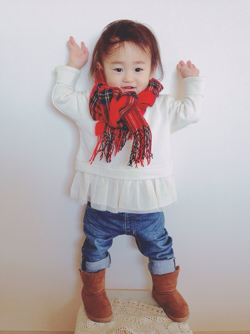 明けましておめでとうございます🌅 ってかもう7日ですねー😅 台に乗せたらこんなポーズ💦 頭は石田純一風(笑) SALEでフリル付きのトレーナー ゲット👍🏻💕なかなか可愛い😍