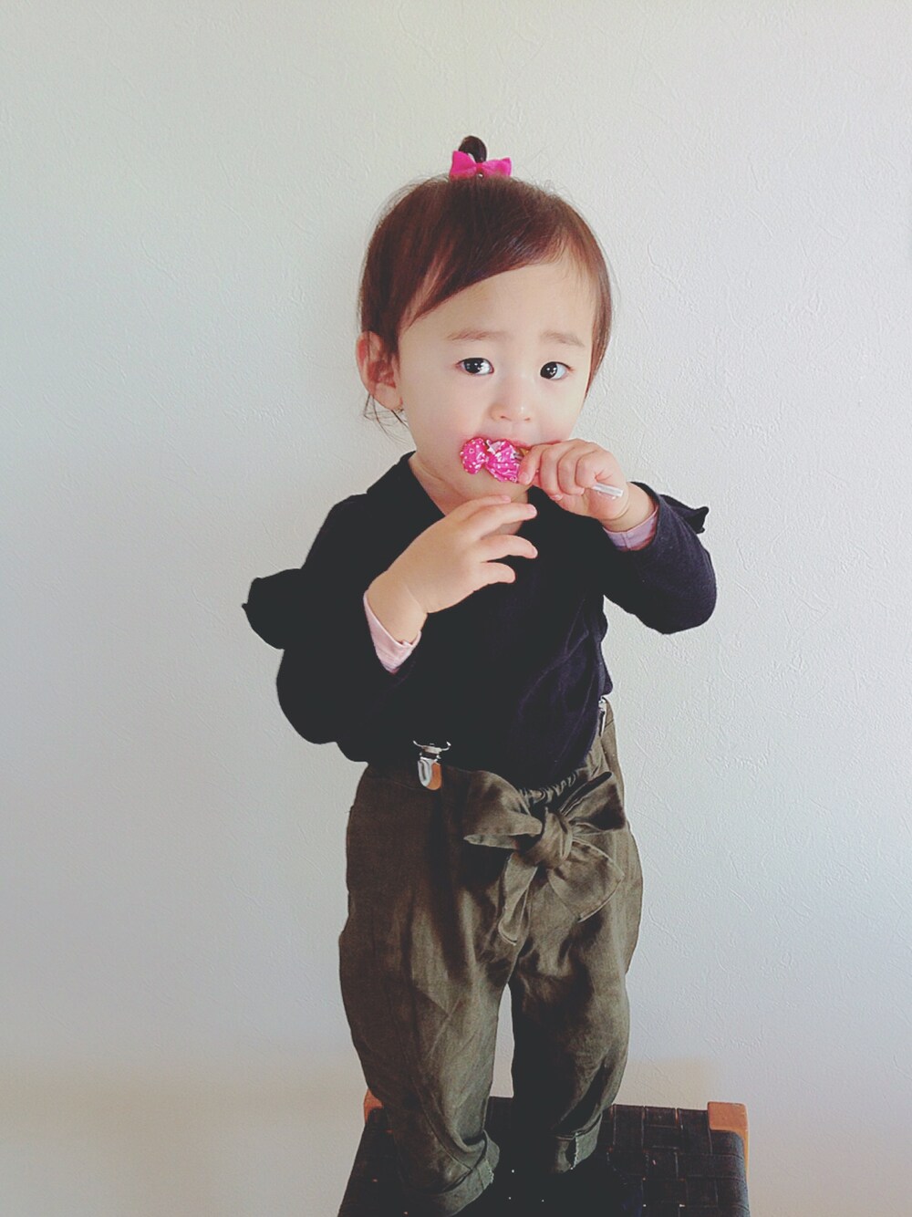 いつもいいね♡セーブありがとう ございます😊とても嬉しいです🙇🏻♀️ 👖のリボンがポイント🎀 サスペで可愛く。 おだんご🍡が傘の持つところ🌂みたいになってます笑 miaさん、今日はめっちゃ早起きしたから今お昼寝(朝寝?)しちゃった‥😂 午前中に買い物行く予定が〜💤