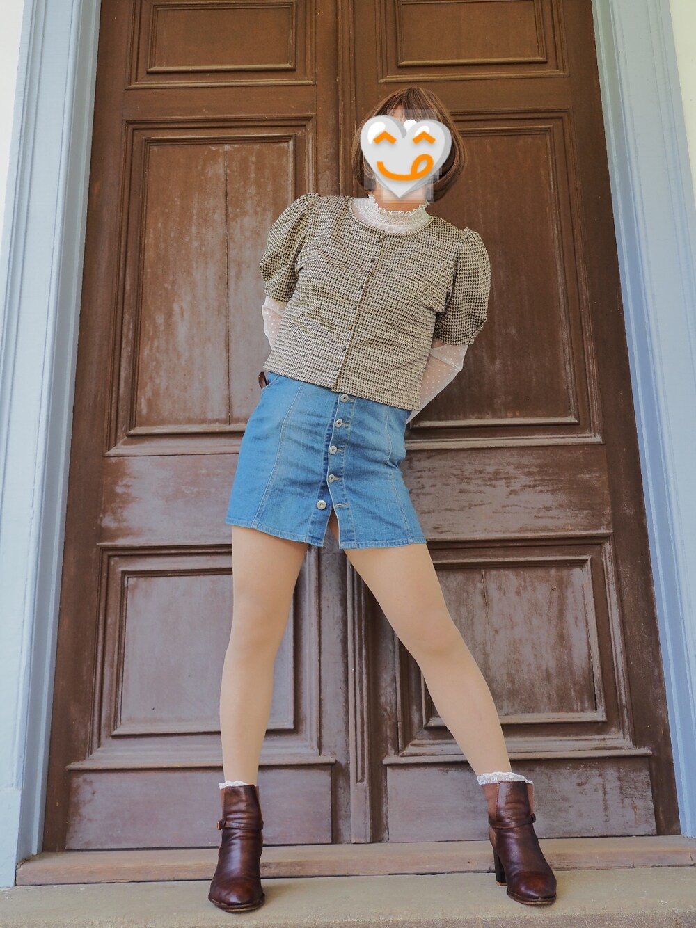 GUジャガードボリュームスリーブとデニムミニスカートで