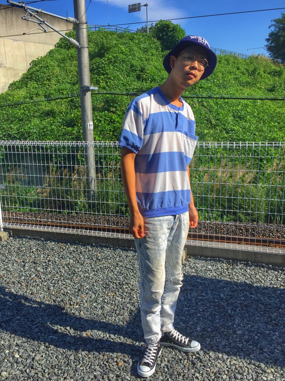 秋晴れと言った所でしょうか?今日も秋らしく行きますよぉ〜! ちなみに今回のコーデはusedがかなり多いので参考になりずらいかもしれません! 全体をブルー系で統一感をだしつつトップスのTシャツとケミカルウォッシュのジーンズで少し人とは違う存在感を出してみました!