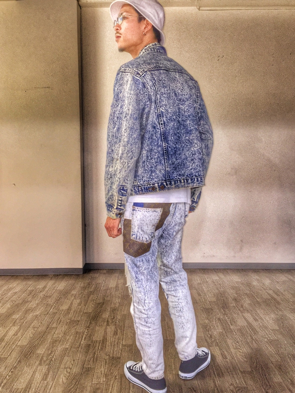 皆さん今日もいかがお過ごしでしょうか?今日は暖かい陽気でしたねぇ🇺🇸 ちなみに今日のスタイリングは全てusedになります^_^ケミカルウォッシュのセットアップに白ハットに白Tシャツになります🎶😎 ケミカルウォッシュのセットアップにはパンツにルイヴィトンのバッグを切り裂きながら作ったリメイク品になりますが!😁👅かなりインパクトがありサラッと着こなすには最高のアイテムになります!皆さんも是非バッグを切り裂きながら作ってみてください笑☀️