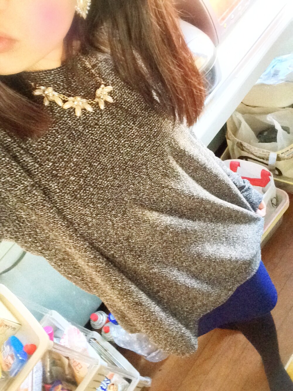 ブラック系のニット/セーター、ブルー系のスカートを着用したレディースの冬コーディネートの1枚目の写真