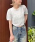 袖がパフスリーブになつているので、二の腕がスッキリして見えます! スカートはデニムなのですが、ストレッチが効いているので、固くなく履きやすいアイテムになっています!