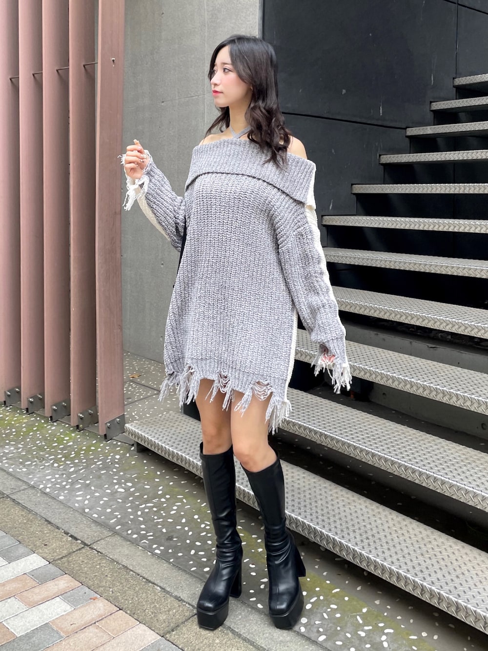 miku(SPIRALGIRL ルミネエスト新宿店)のワンピース「チョーカーオフショルバイカラーニット」を使ったコーディネート