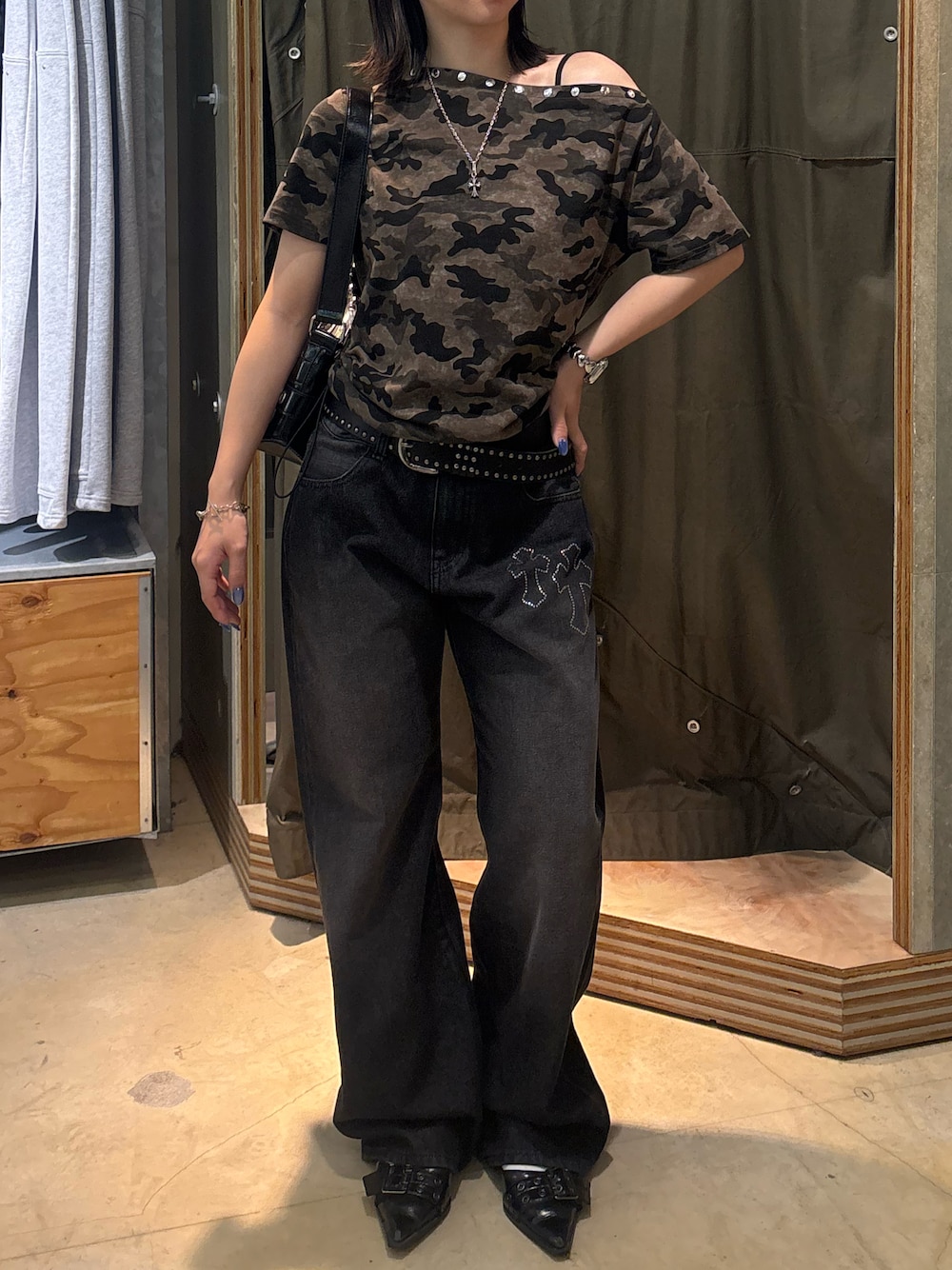 サクヤのTシャツ/カットソー「アソート (カモ柄/ヒョウ柄)/ドット柄)スタッズドロストワンショルTEE」を使ったコーディネート