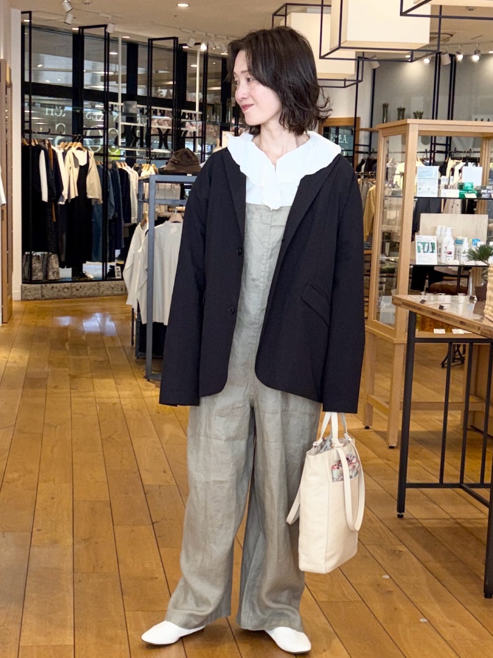 かぐれのコットンテーラードと比べると、より女性らしいシルエットが特徴のウェザーテーラードジャケット。ドロップ気味のショルダーと全体的に丸みのあるデザインが、シンプルスタイルに柔らかさをプラスしてくれます✨ シューズのバブーシュは、スニーカーでは出せない、かぐれ好きのスタイリングを上手にまとめてくれます✨