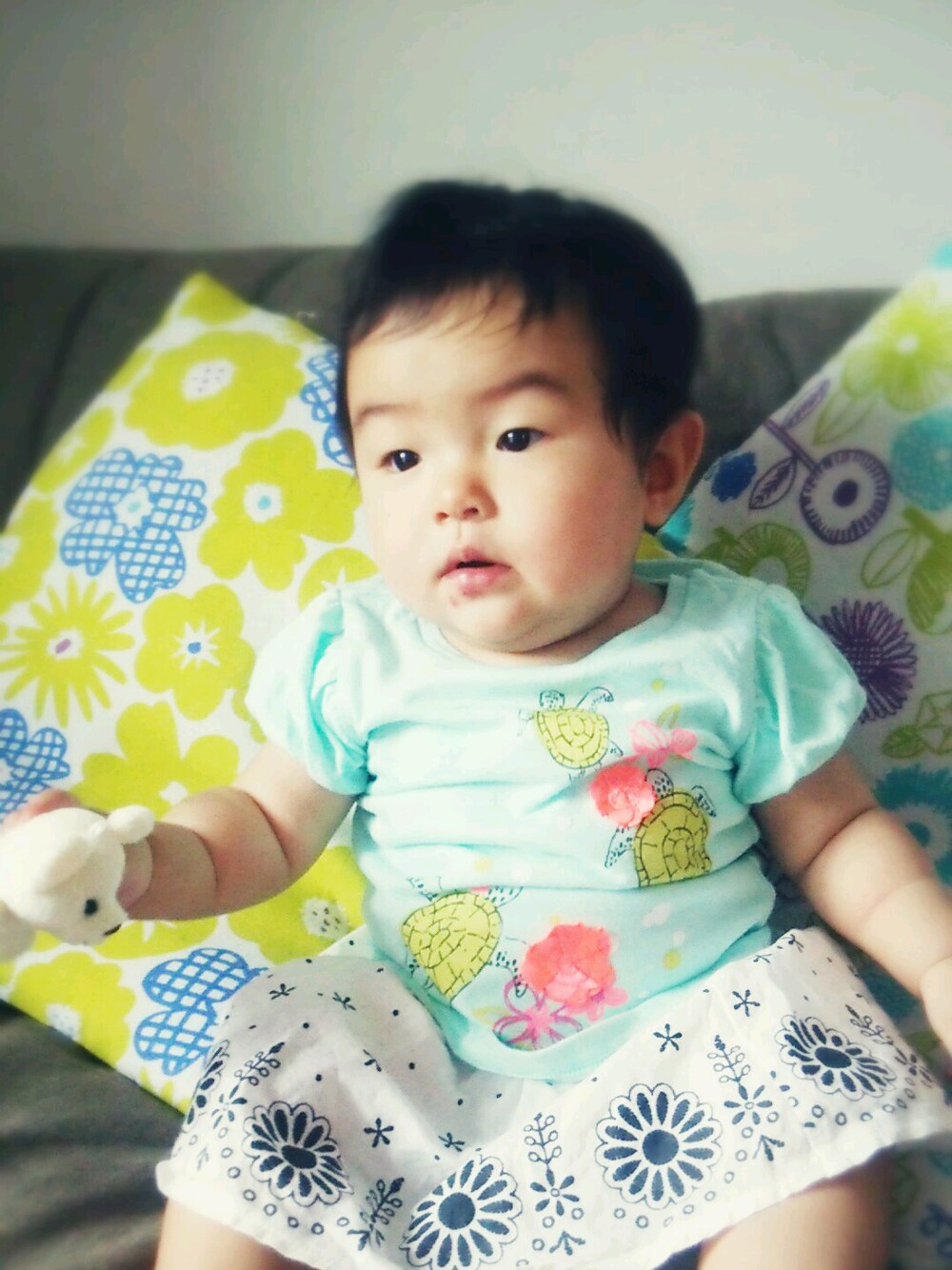 このスカート、下にパンツがセットになってるから、ハイハイでも気にせず使えていいかも(。・ω・。) Tシャツは女の子らしくパフスリーブ(*^^*)