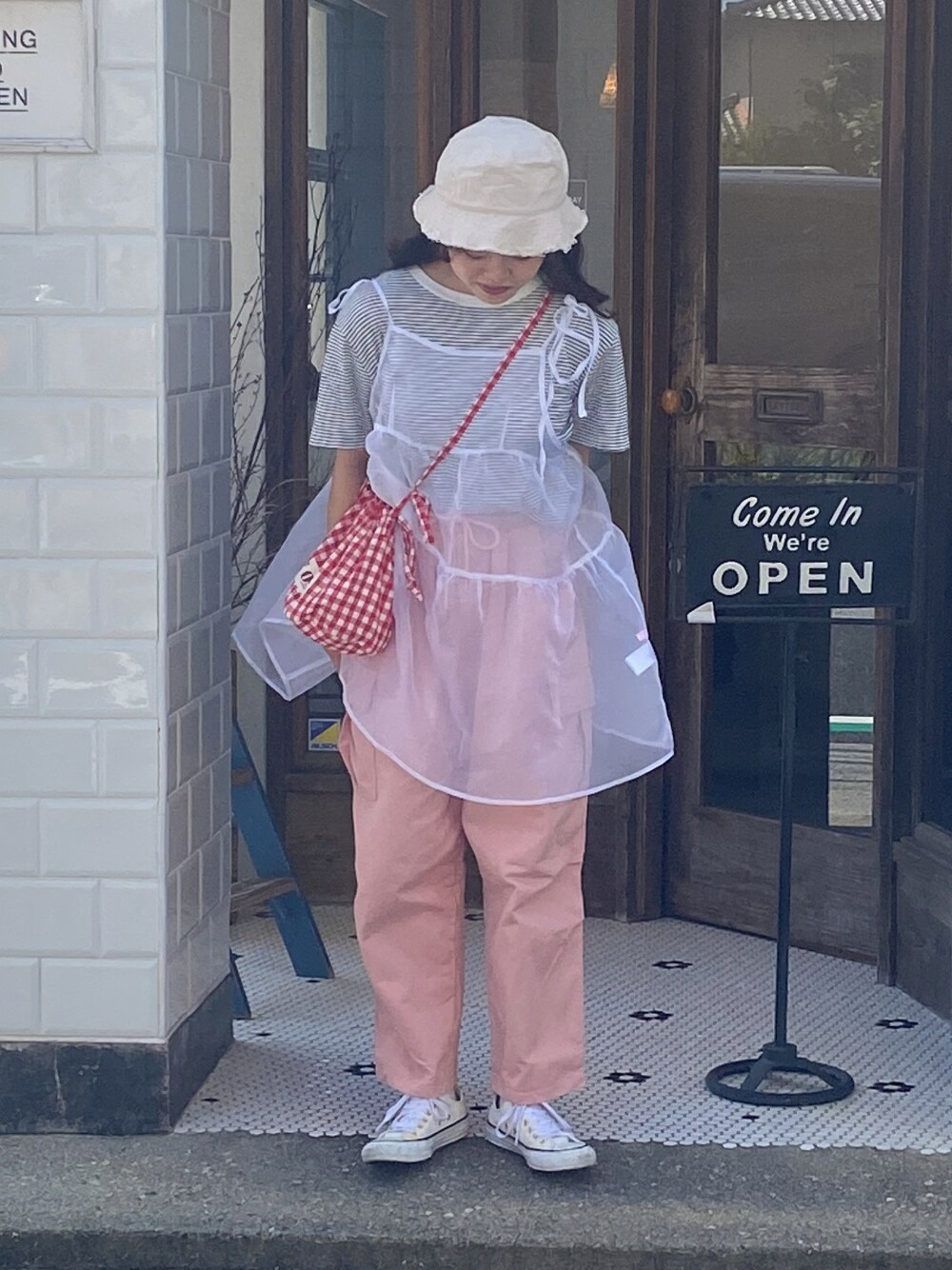 おはようございます! 夏のピンクコーデ🩷🐰🩰👱🏻♀️🎀 1番のポイントはピンクカーゴパンツ! このパンツによって、パッと印象づくコーデに! 可愛いピンクカラーかつカジュアルなパンツ! パンツにカラーを統一させるように、 バッグもピンク系をチョイスしてみました! ギンガムチェックのポーチで、カジュアルでキュートに! また、トップスは、ボーダーTシャツをチョイス!この日は、ガーリー系で出かけたい気分だったので、上から、シアーキャミワンピースを組み合わせてみました💕🎀💕🎀