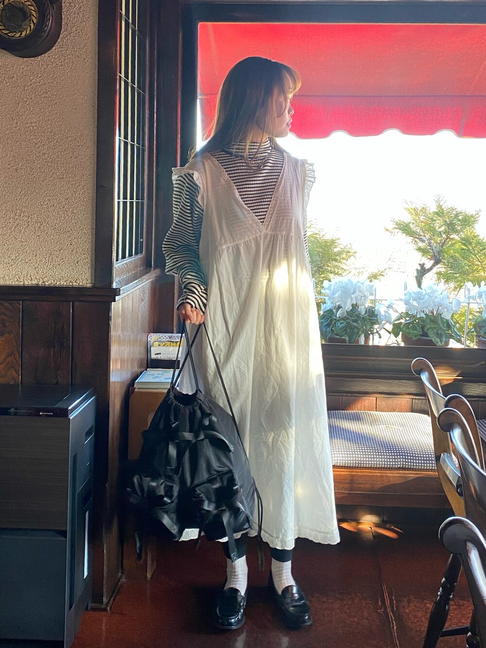 おはようございます☔️ 喫茶店に行った時のコーデ🎶⭐️ 黒ボーダーのタートルネックと 白ワンピースの組み合わせ👗 バッグやシューズ等の小物も黒で統一させ、 可愛らしいモノトーンコーデにしました!