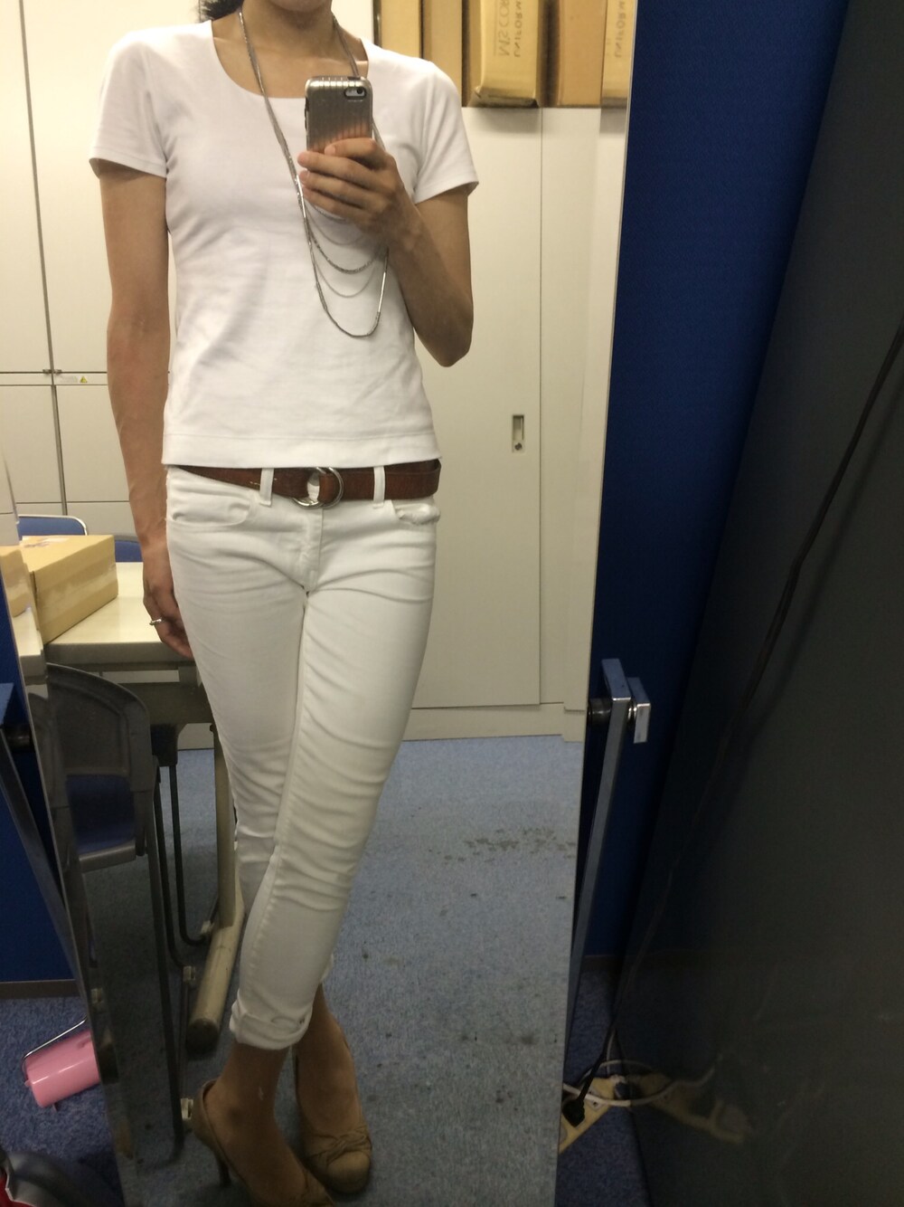 オフィスコーデ ホワイト×ホワイトの締め色にキャメルを! Tシャツ:ru パンツ:American eagle ベルト:BEAMS パンプス:DIANA ネックレス:H&M