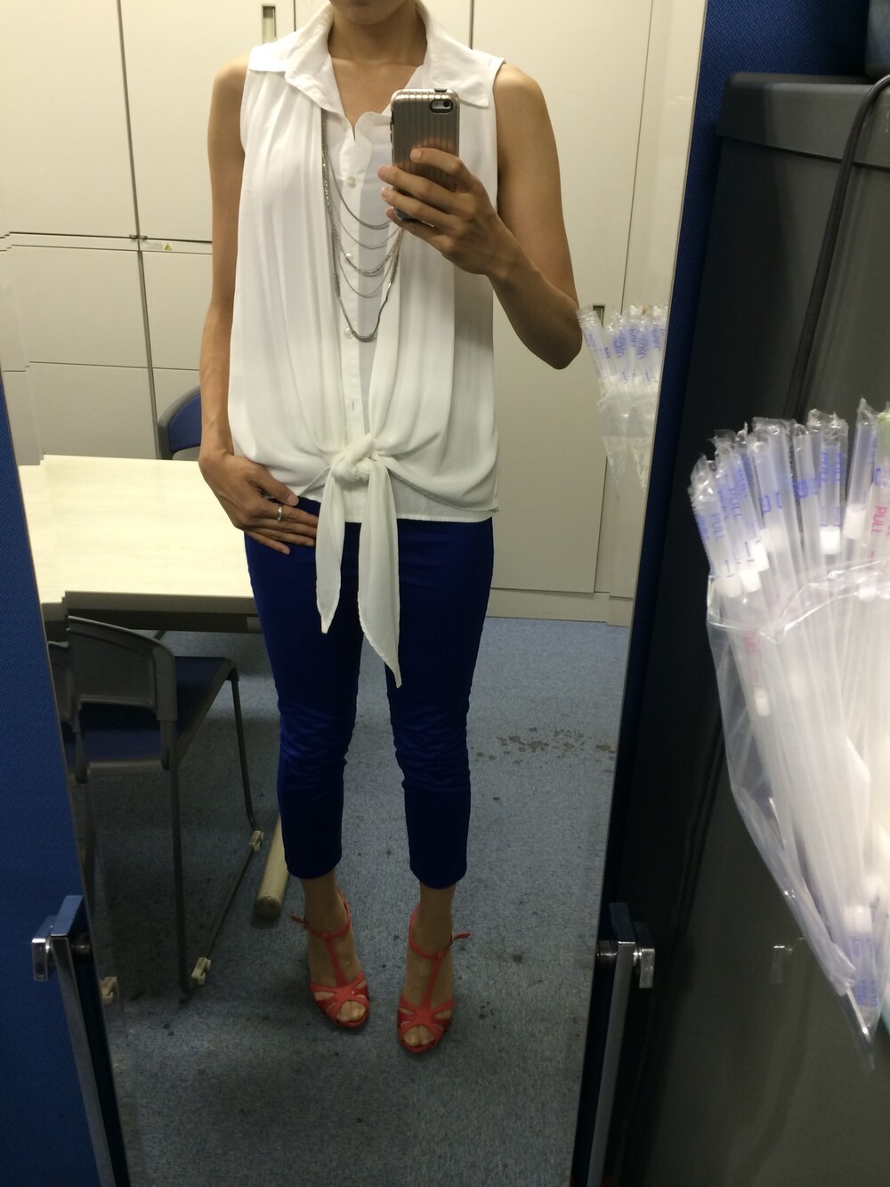 閲覧いただきありがとうございます。 トリコロールカラーコーデ トップス:M.deux パンツ:UNIQLO ネックレス:H&M パンプス:DIANA