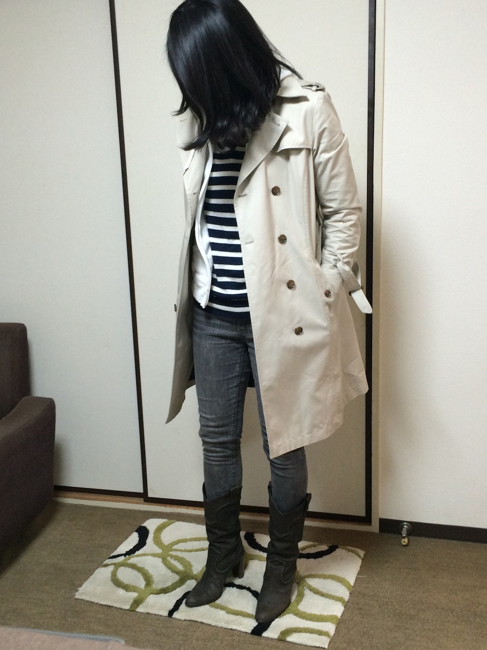 トレンチとパーカーでカジュアルダウン。 だけど足下はかっちりブーツで。 きちんとカジュアル。 ニットとパーカーをレイヤードしてみました!