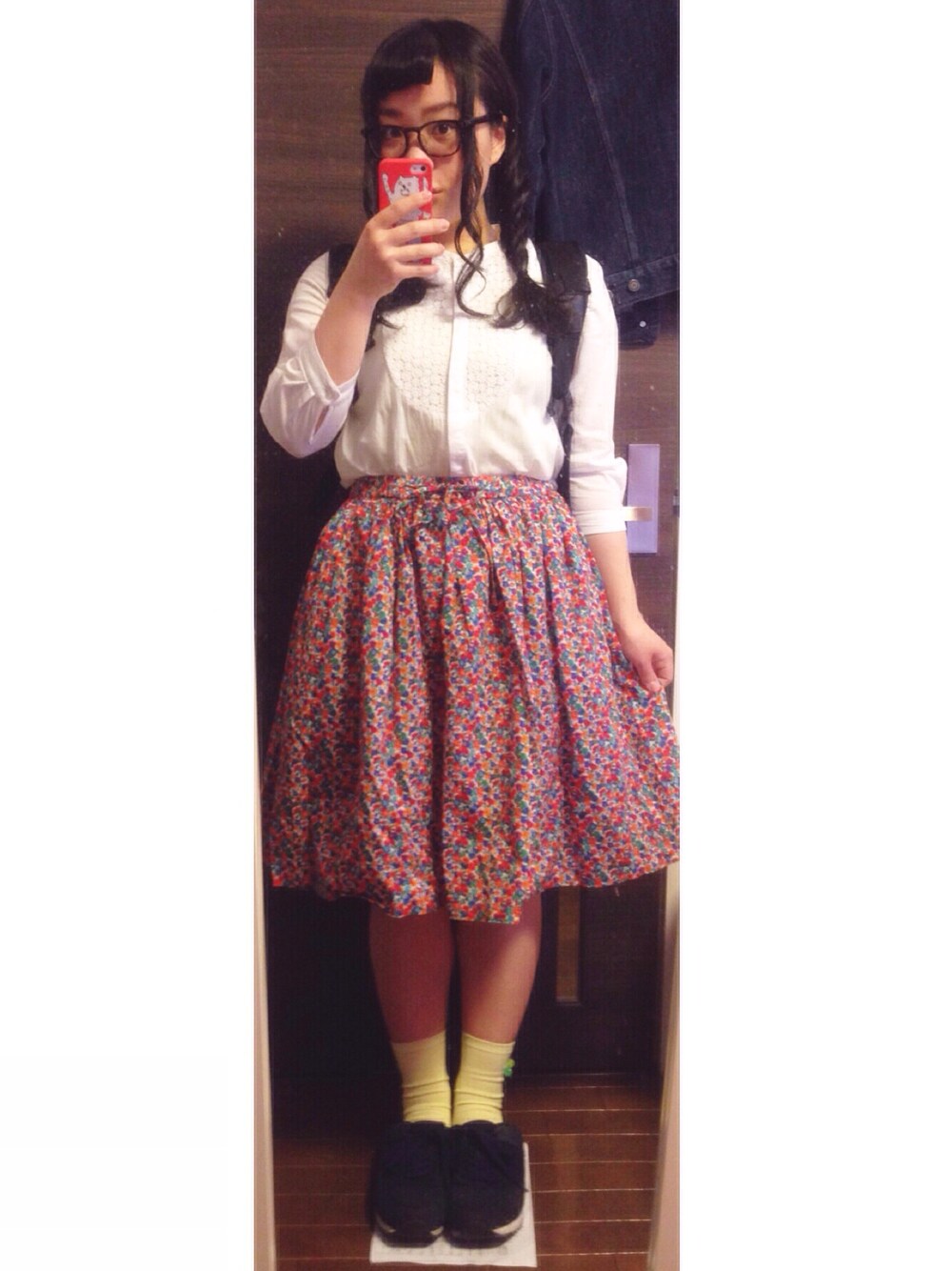 2015.04.28 ( tue ) ☀︎ 一日乗り越えたぞー 。 トップス ▷ GLOBAL WORK スカート ▷ studio CLIP 靴下 ▷ tutuanna リュック ▷ NIXON