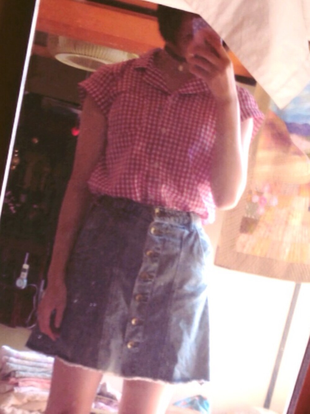 ホワイト系のデニムスカート、レッド系のシャツ/ブラウスを着用したレディースの夏コーディネートの1枚目の写真