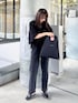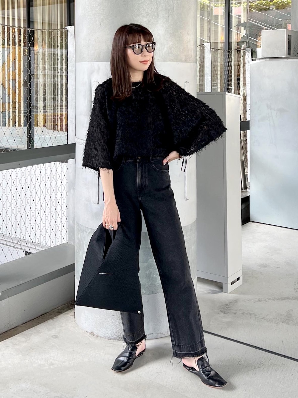 THE YOnのトップスとブラックデニムで オールブラックコーデ❤️ 透け感のあるシャギー素材が今の時期にぴったり!