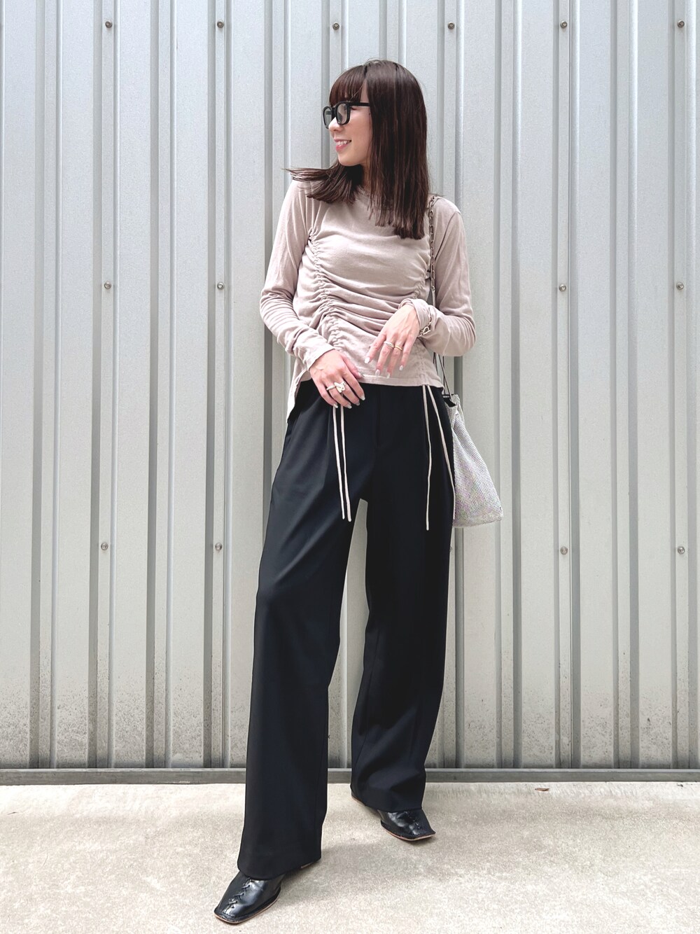 M_のトップスはシャーリング部分を調節して 好きなシルエットで着ることが可能❤️ しかも前後を逆に着てもOKな2wayなので、 かなり着回しできそう! 是非商品ページで詳細みてね🙆♀️❤️ UNIQLOのタックワイドパンツはお気に入りすぎて 4本持ってます笑 今回履いてるのはワンタック、丈標準のMサイズでした🙆♀️✨