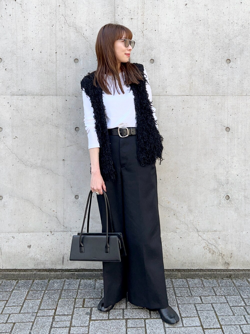 MINAEのベスト「ループヤーンフリンジニットベスト」を使ったコーディネート