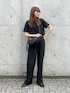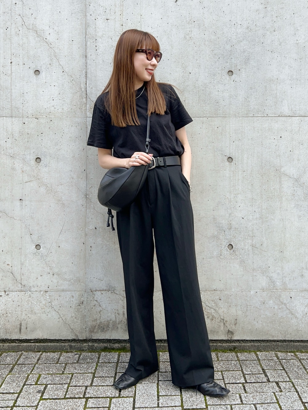 黒の無地Tに黒のスラックスを合わせたシンプルコーデ! サングラスやベルト、バッグなどで自分らしさをプラスしました❤️