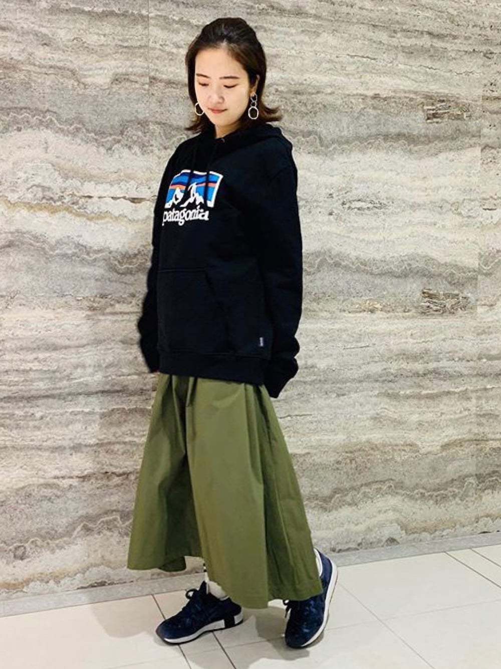 パタゴニアのパーカーとカーキのスカート の相性◎ 動きやすく楽ちんなコーデがお気に入り☺️