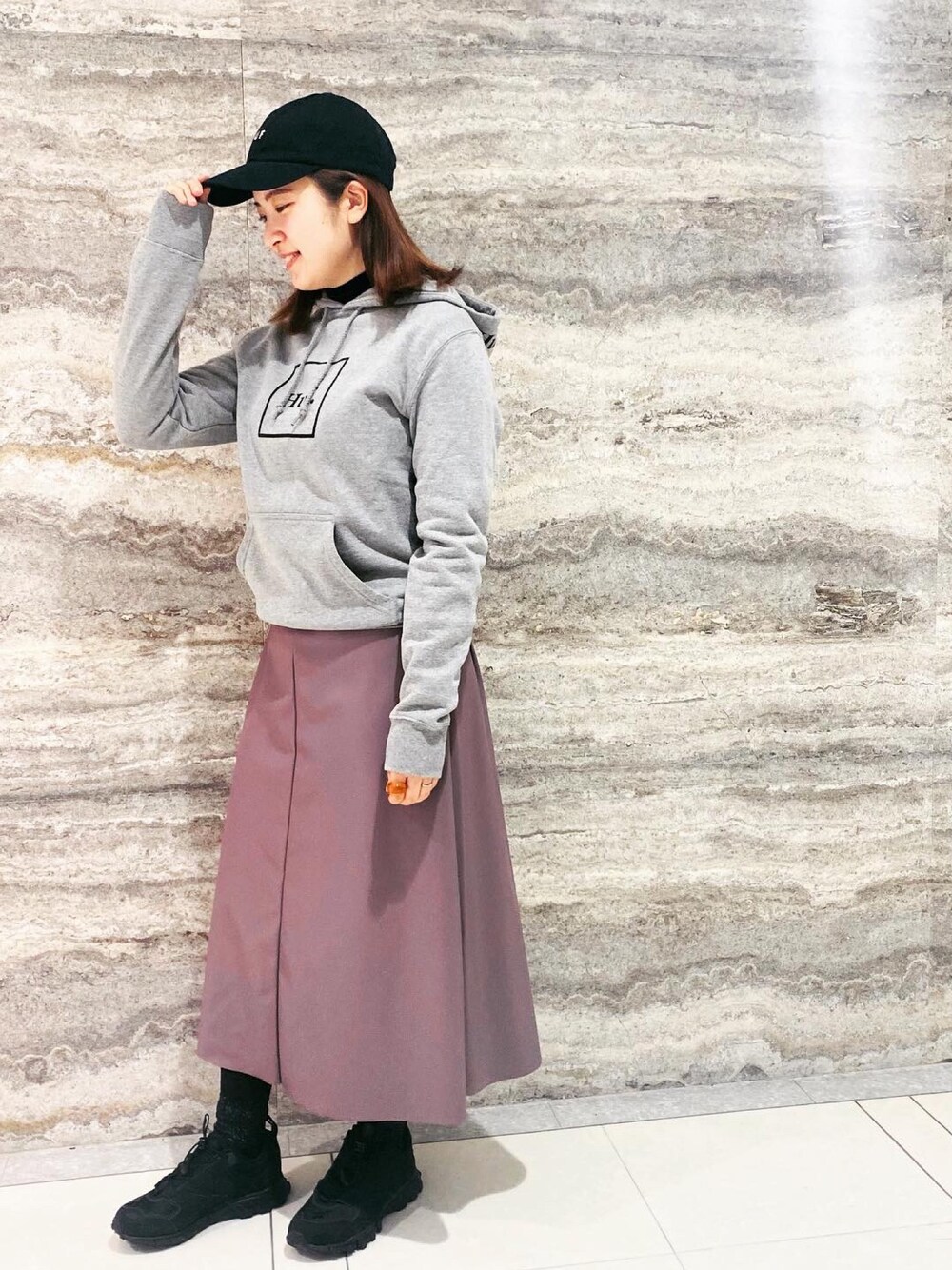 HUFコーデ💕 ピンクのレザースカート とグレーのスエットが合う😍 キャップとスニーカーを黒で引き締めて◎