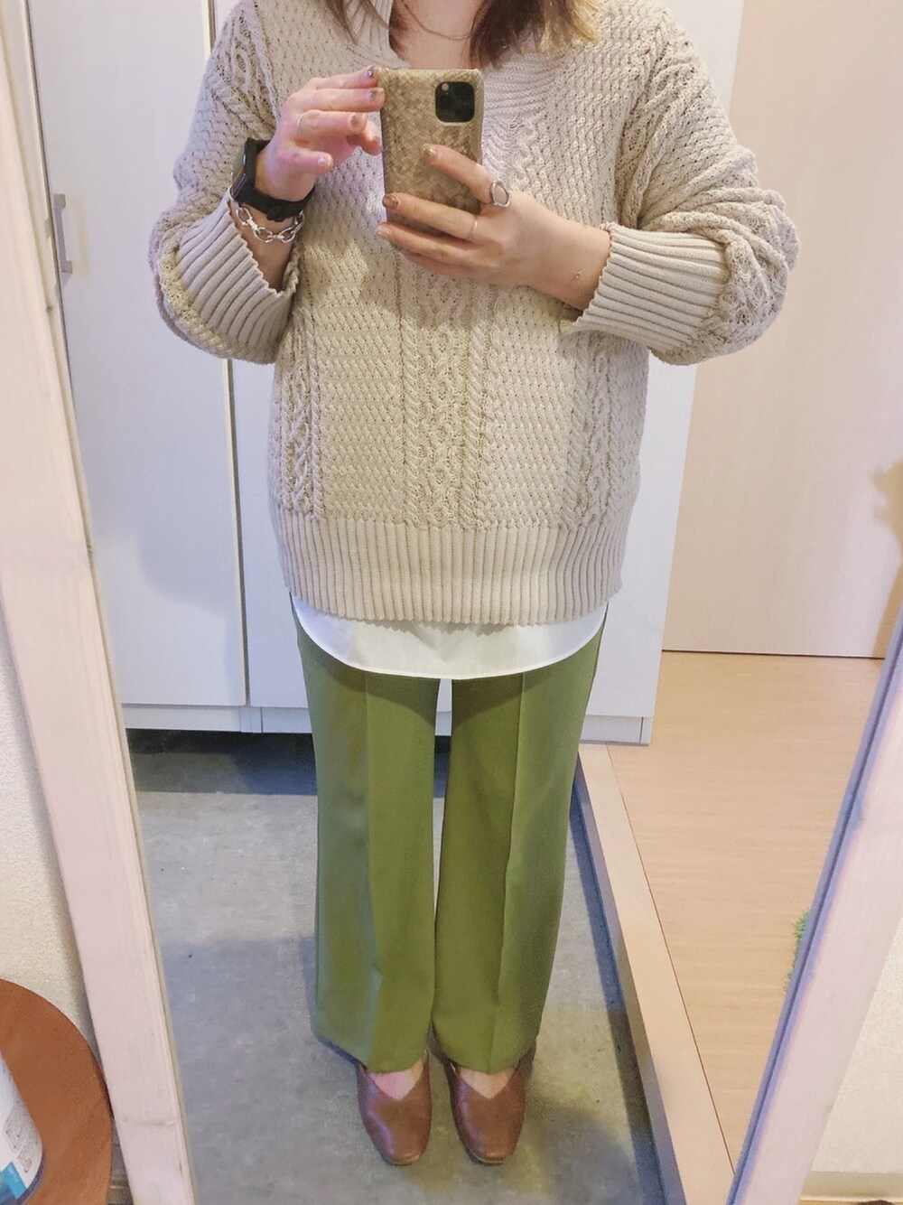 今日の出勤コーデ キーネックの綿ニットが着たくて¨̮ 昼間の暖かさにも 夕方で少し冷えてきても 綿ニットだと調節しやすくて👌