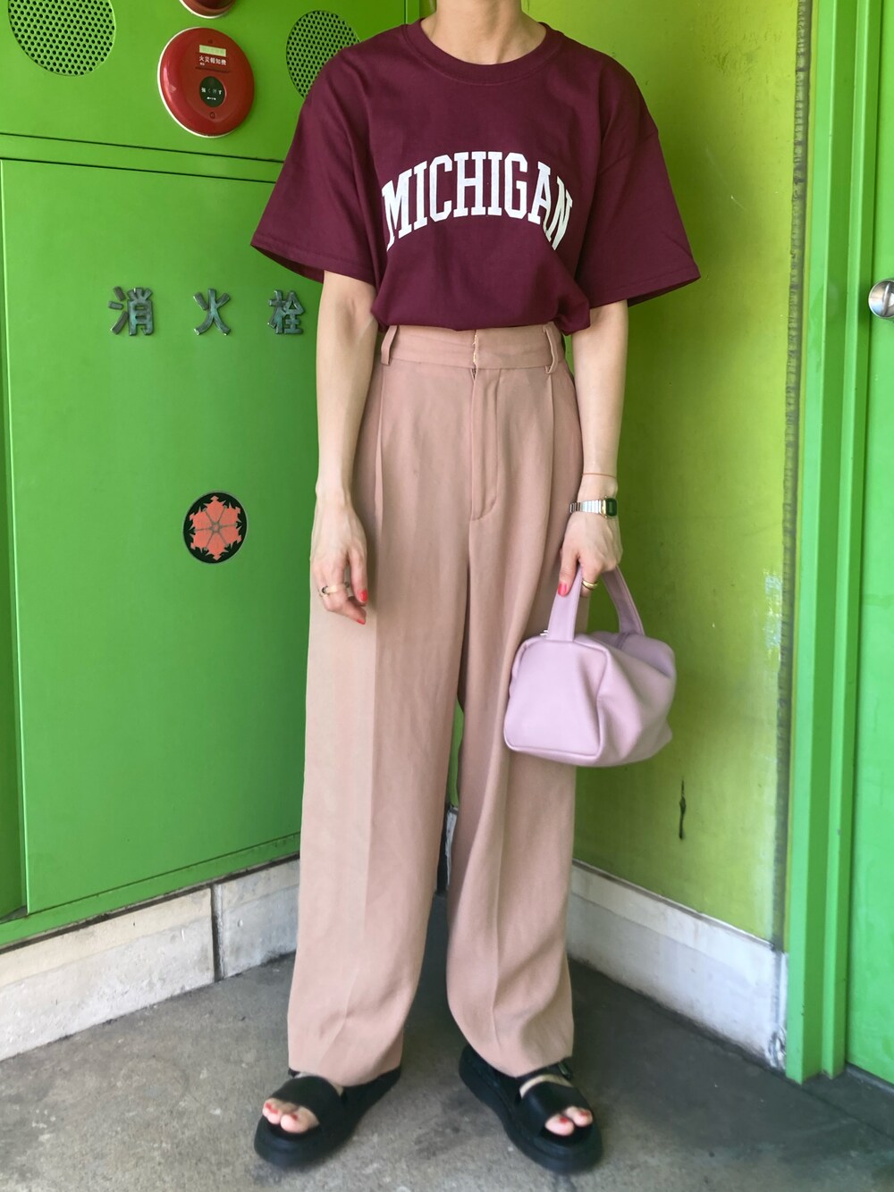 レッド系のTシャツ/カットソーを着用したレディースの夏コーディネートの1枚目の写真