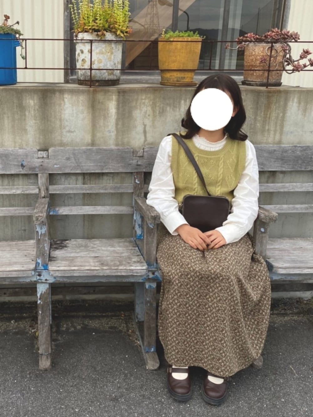 . wearはじめました! . 上下緑系だから小物は茶色でそろえた𖡼.𖤣𖥧 エヘカソポのニットベストがお気に入り🍃
