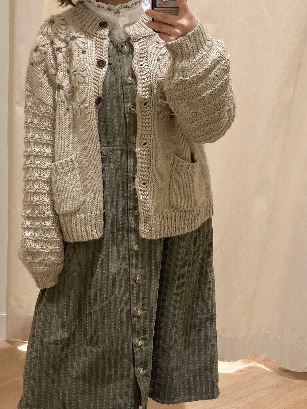 . 去年買ったジャンスカずっとお気に入り🦖 お花のカーディガンはちょっとほつれてきて悲しい… . (時系列とお別れしました……)