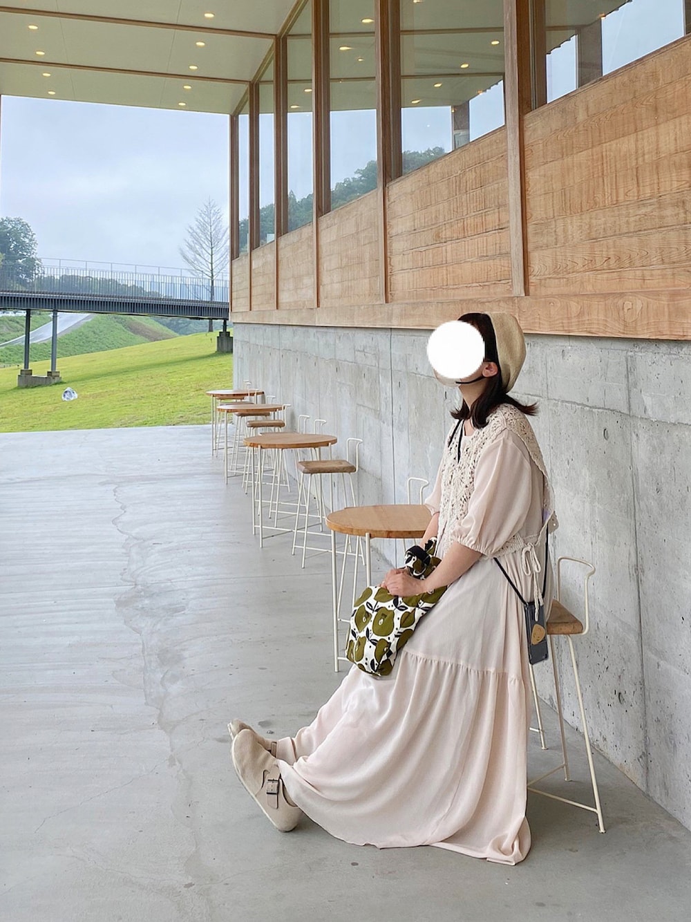 . ちょっと前のコーデから帽子だけ変えた☁️ 座ると裾ついちゃうのはご愛嬌…