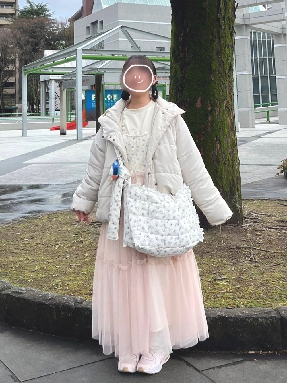 お気に入りのワンピースをカジュアルに着たい!のコーデ🐏 ダウンと合わせるのかわいい〜!