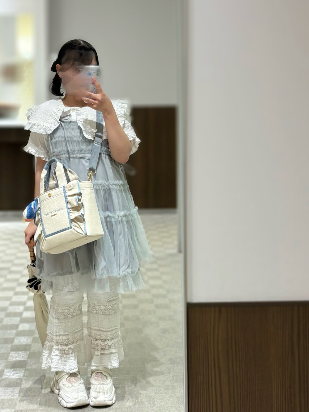 水色コーデが多いから水色の鞄を購入した☁️ 最近はライトブルーのレースパンツばっかり履いてたけど、白もかわいい♩